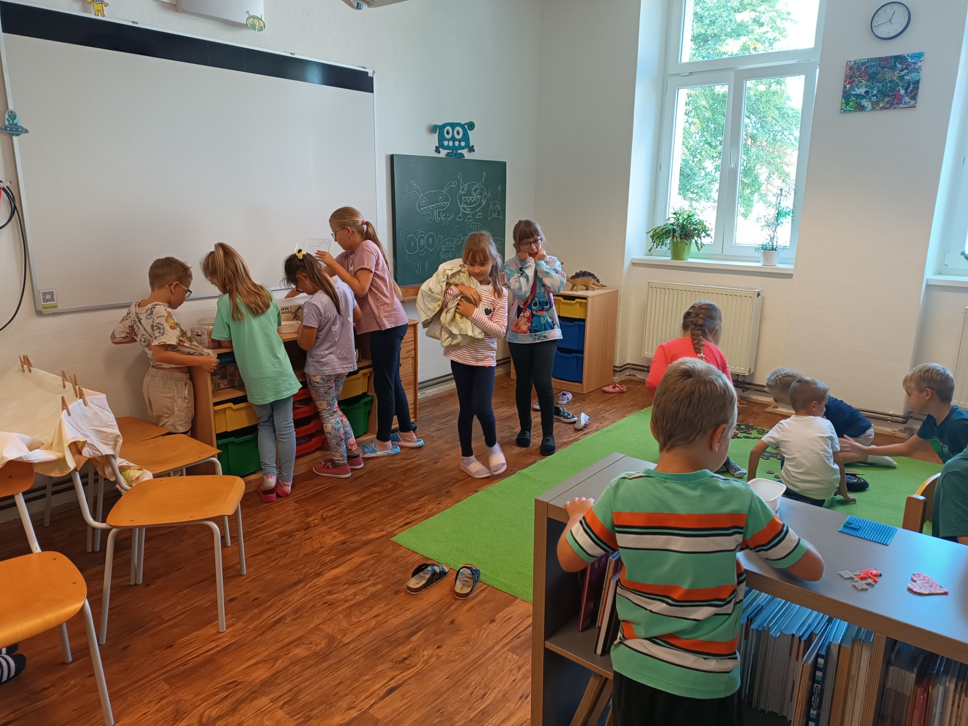 Užívali jsme si pobyt na školním hřišti a zahradě, chodili na procházky, spali v družině, plnili výzvy a díky nim získali mimozemšťany do našich kartiček. Někteří z nás se dokonce stali vychovateli - převzali jsme roli paní vychovatelky a připravili si činnosti místo ní. Prostě jsme si užili pobyt v družině mezi svými kamarády. Jak jsme se měli uvidíte na našich fotografiích.