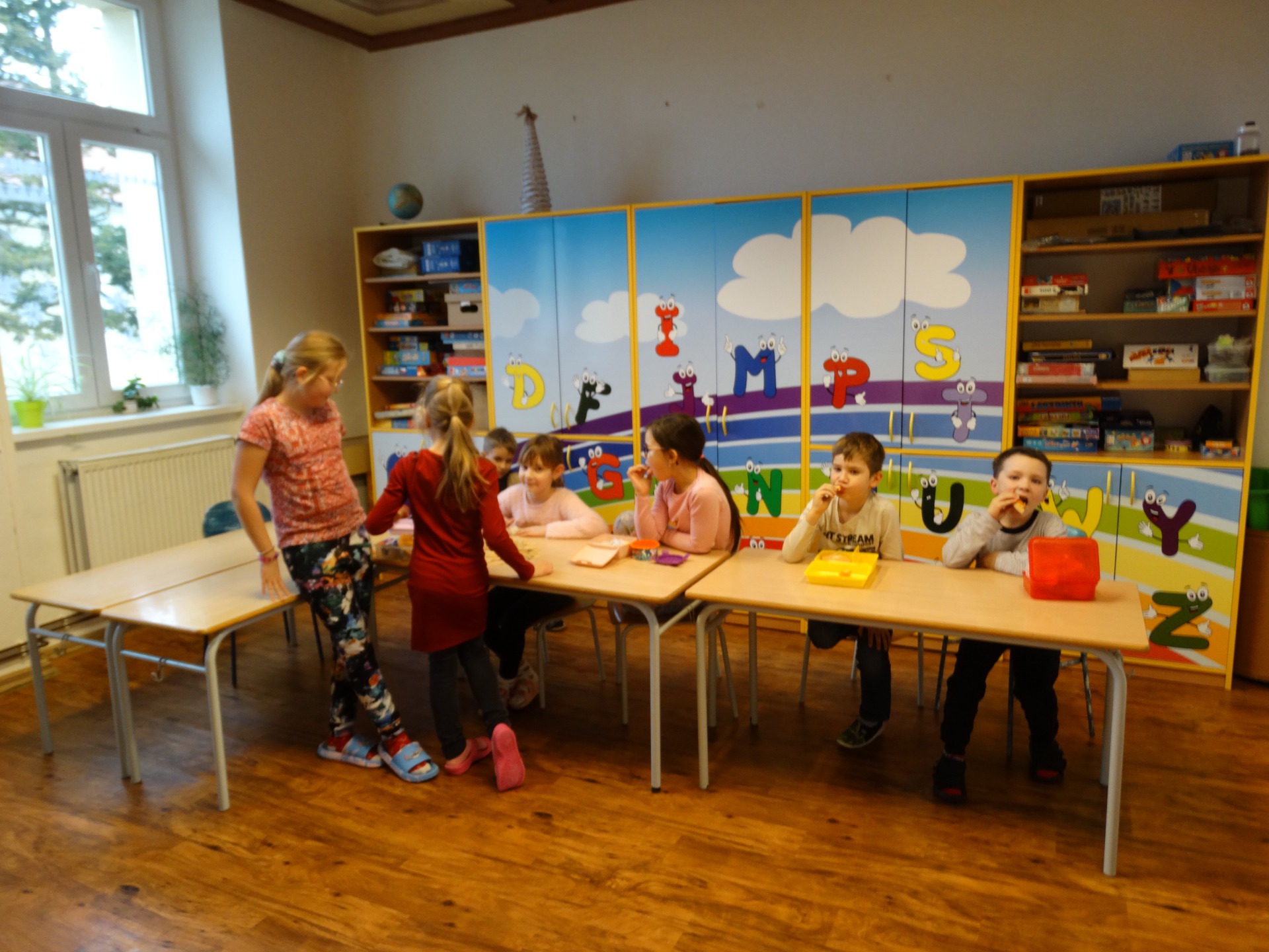 Hráli jsme různé hry, malovali, trénovali mozek, společně četli knihu "Fredy, největší strašpytel bojuje s pirátem". Vyrobili jsme si náramky stylem splétání ˇšňůrek, kterému se říká Kumihimo. Pekli společně koláče. Každý den jsme chodili na školní hřiště a v pátek na dlouhou procházku. Více uvidíte na našich fotografiích.